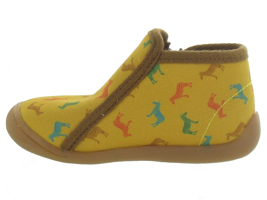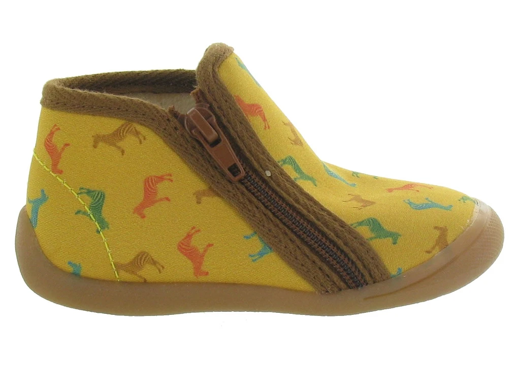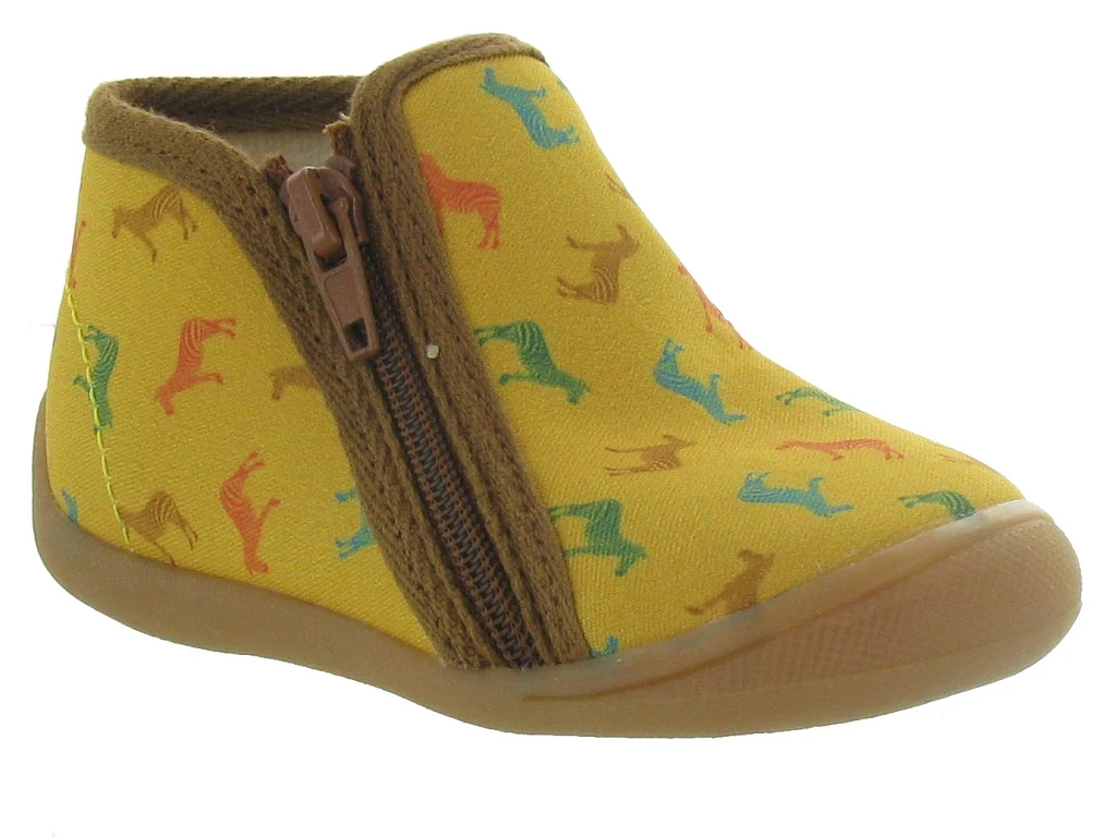 Chaussons à fermeture éclair latérale.Ces jolis chaussons couleur jaune modèle PERSAN sont très originaux par leurs couleurs et motifs animaliers. BELLAMY les a voulus esthétiques mais aussi pratiques.