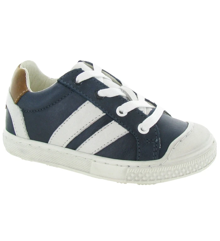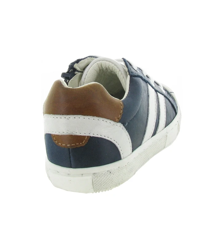 FAC, une jolie paire de baskets à lacets pour les garçons. Très beau cuir bleu marine avec des empiècements blanc et marron, on remarque également sa semelle toute blanche qui apporte de la lumière sur l’ensemble.