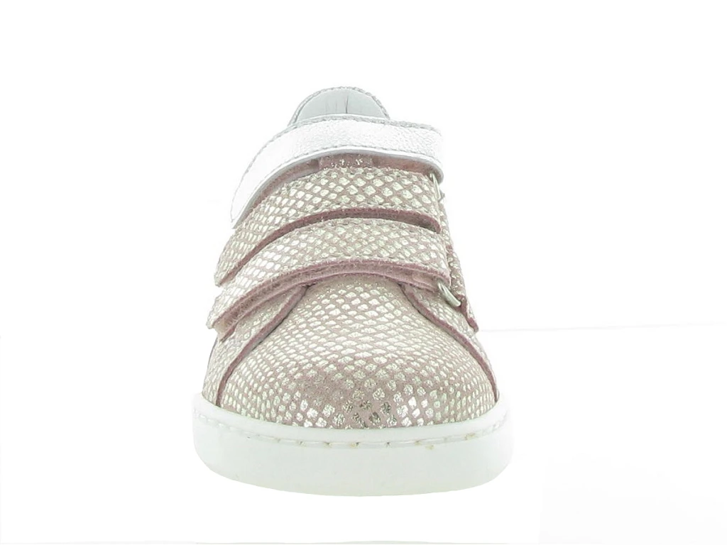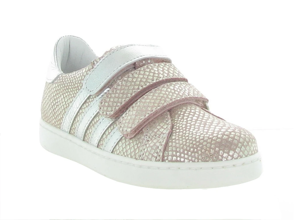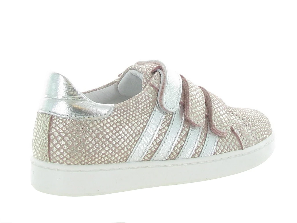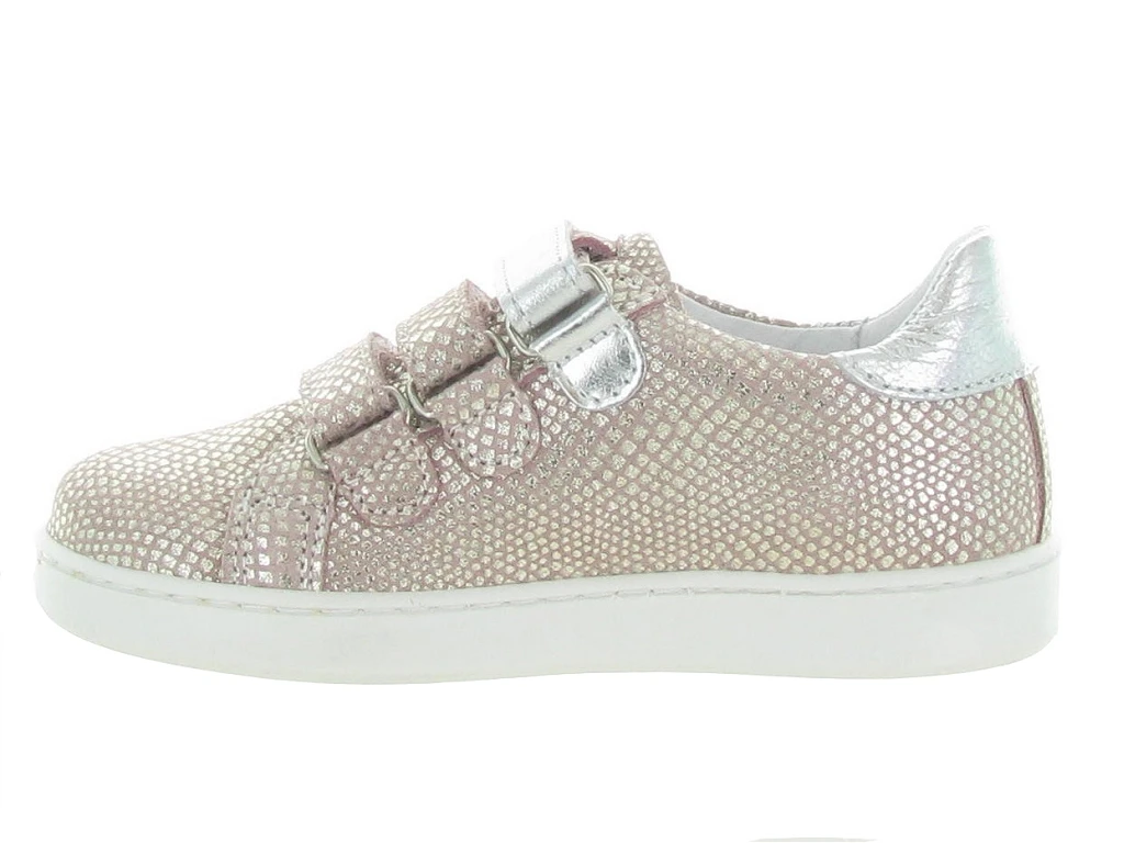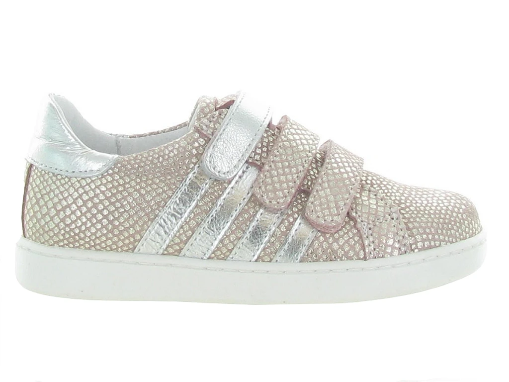 En vous proposant ces sneakers à triple scratch, BELLAMY a pensé à la facilité de chaussage mais aussi au look très sympa.la couleur rose opale, précieuse, est inspirante.Les quatre bandes argent sur le côté, le scratch et le sommet du contre-fort argenté, contrastent joliment avec le cuir laminé rose de la chaussure. Comme toujours, le haut du contre fort et la languette intérieure sont matelassés.