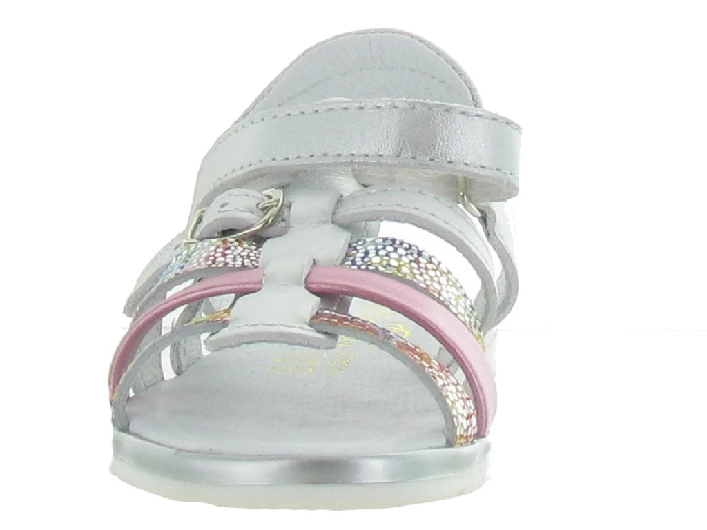 Côté esthétique, cette sandale est un véritable bijou avec ses tons gris argent pailleté et sa fine lanière rose qui rend la chaussure trendy. La boucle argent ajoute une touche précieuse. Les mamans pressées apprécieront le scratch pour l’ouverture et la fermeture de la sandale, un gain de temps non négligeable !